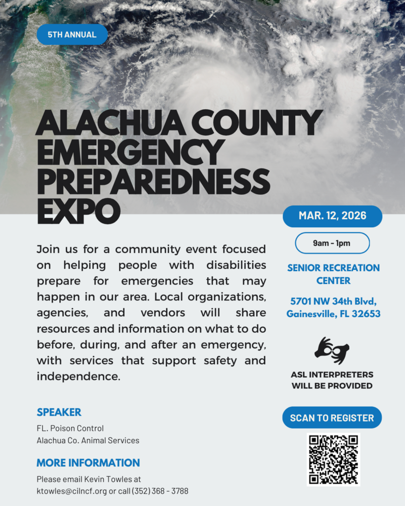 Join the Center for Independent Living of North Central Florida and community partners for the 5th Annual Alachua County Emergency Preparedness Expo, a free community event focused on helping people with disabilities and their families prepare for emergencies in our area.