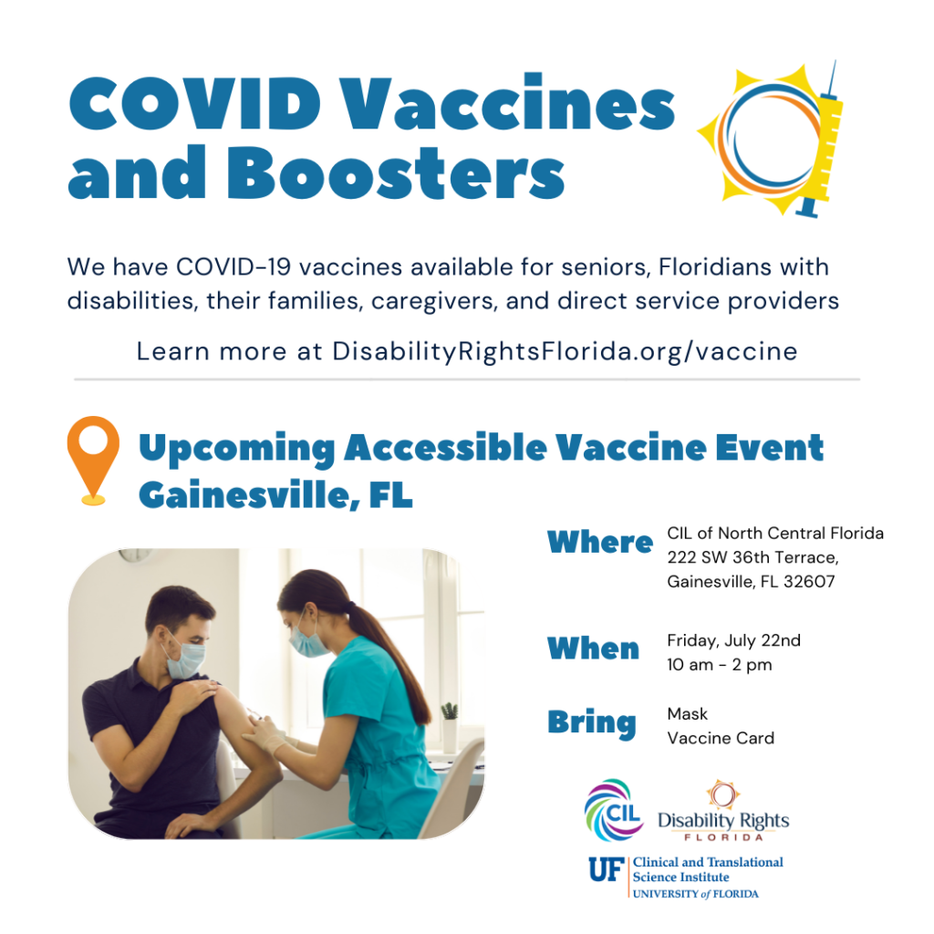 This event will take place at the Center for Independent Living, 222 SW 36th Terrace, Gainesville, FL 32607, and you will need to bring your vaccine card and a mask. We have COVID-19 vaccines available for seniors, Floridians with disabilities, their families, caregivers, and direct service providers. Learn more at DisablityRightsFlorida.org/vaccine