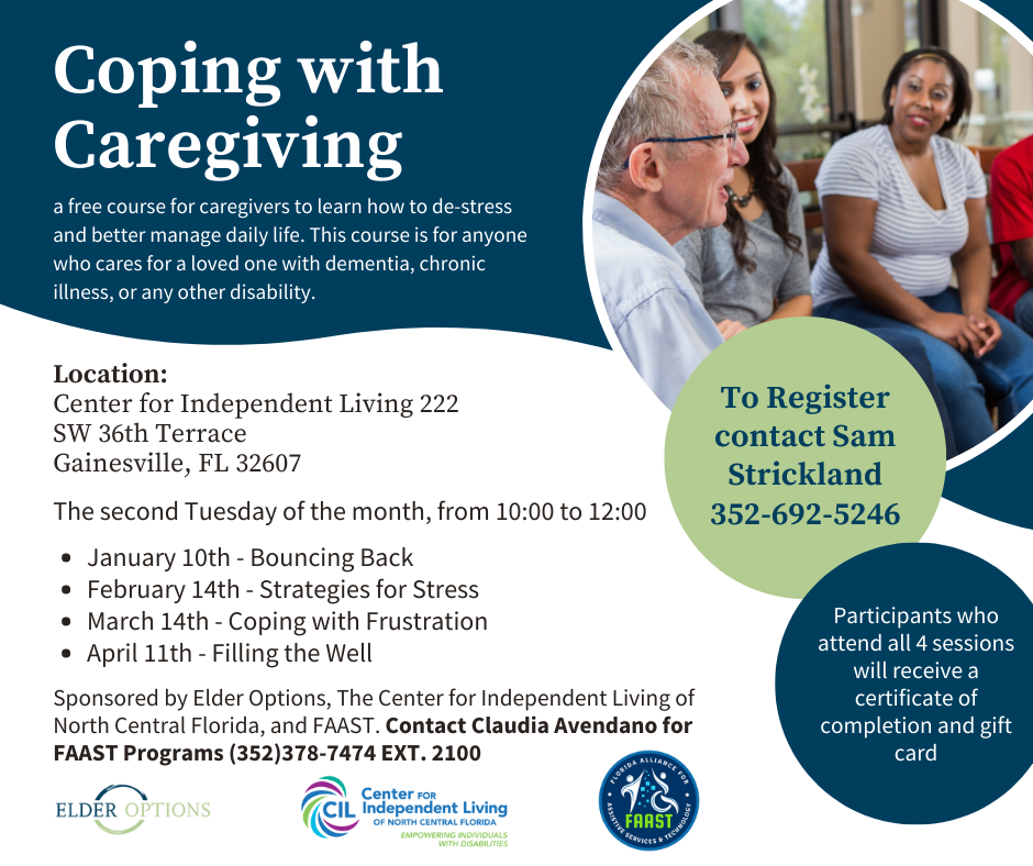 Sponsored by Elderly Options The Center for Independent Living of North Central Florida, and FAAST. Contact Claudia Avendano for FAAST Programs (352-378-7474 ext. 2100